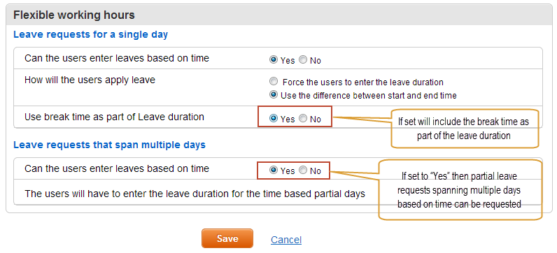 - Use break time as part of Leave duration – If “Use the difference between start and end time” is set, the option to include the break time as part of the leave duration can be set.